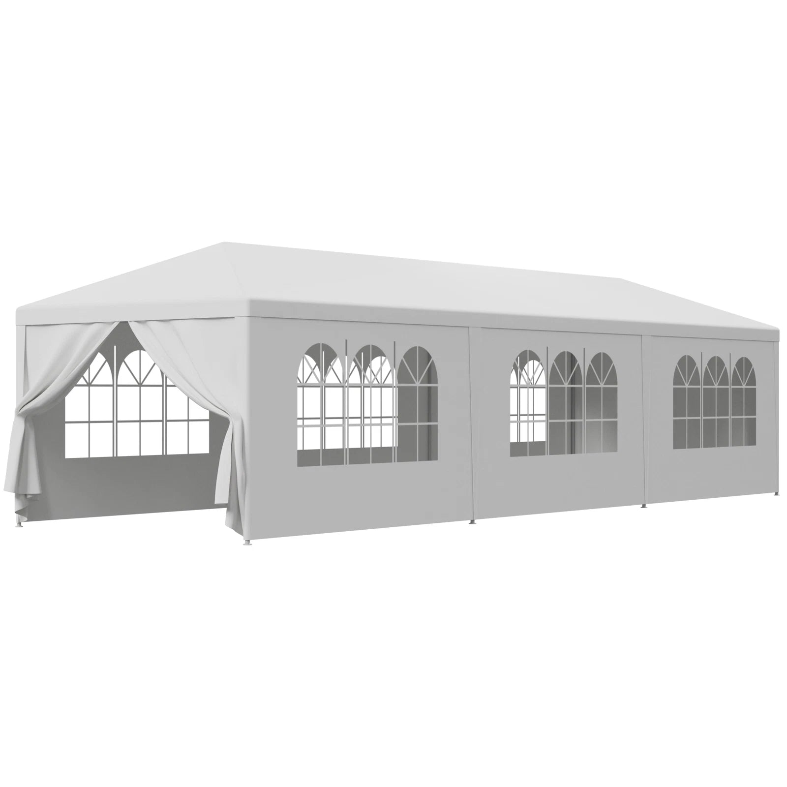 Completely new and boxed, this 10'x30' white gazebo canopy features a durable waterproof polyethylene cover and a rust- and corrosion-resistant powder-coated steel frame. Designed for commercial applications, parties, and outdoor gatherings, it includes eight removable walls secured with Velcro for convenient setup and takedown. The package comes with ropes, stakes, and a detailed installation manual to ensure enhanced stability and straightforward assembly.