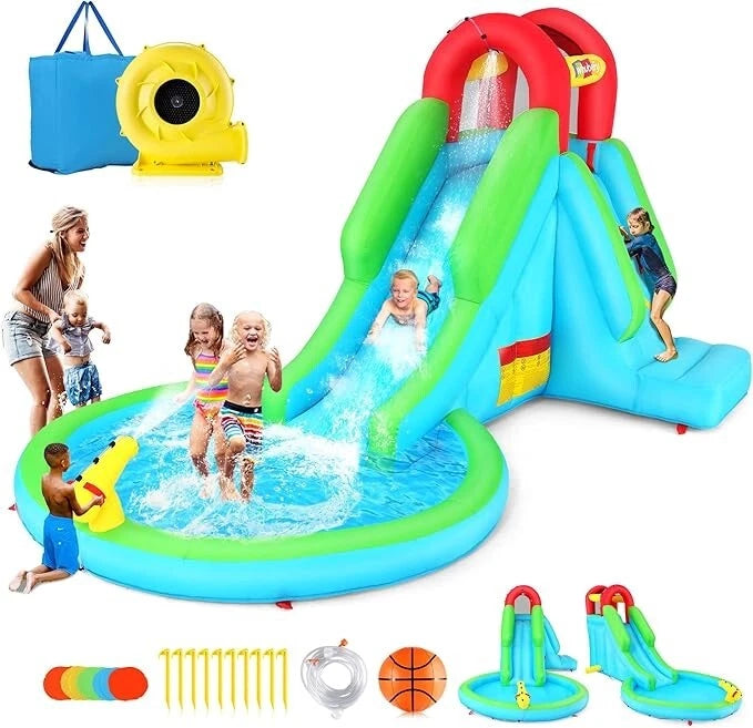 Water Slide Bouncer House, Inflatable Water Park with Air Blower & Water Cannon